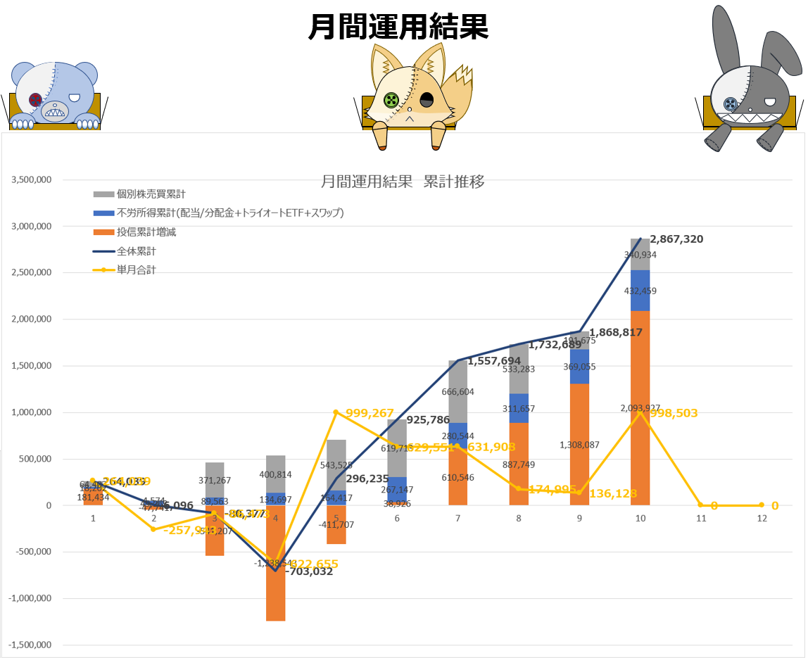 10月利益としては不労所得②+④+⑤=+63,404円です