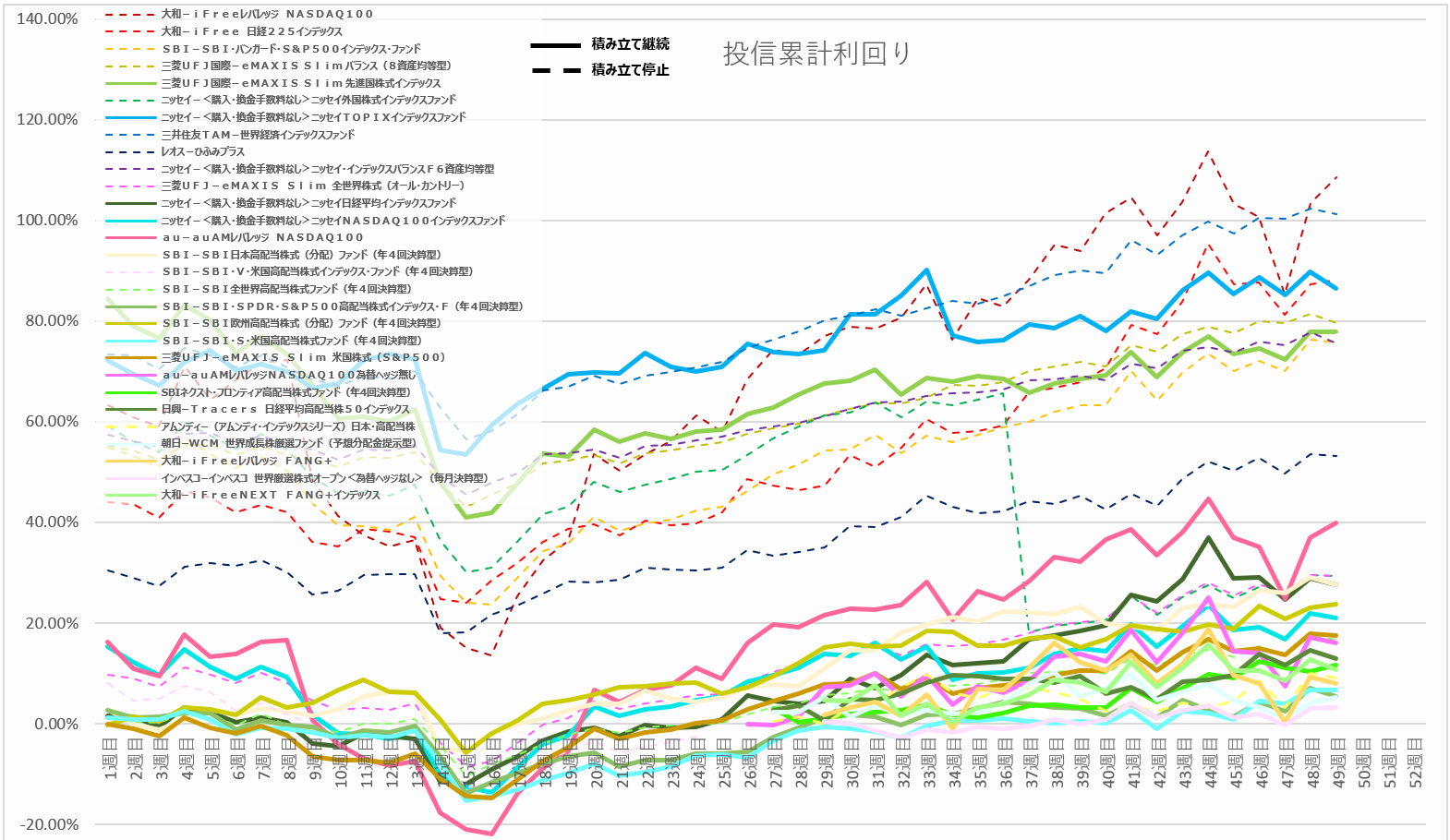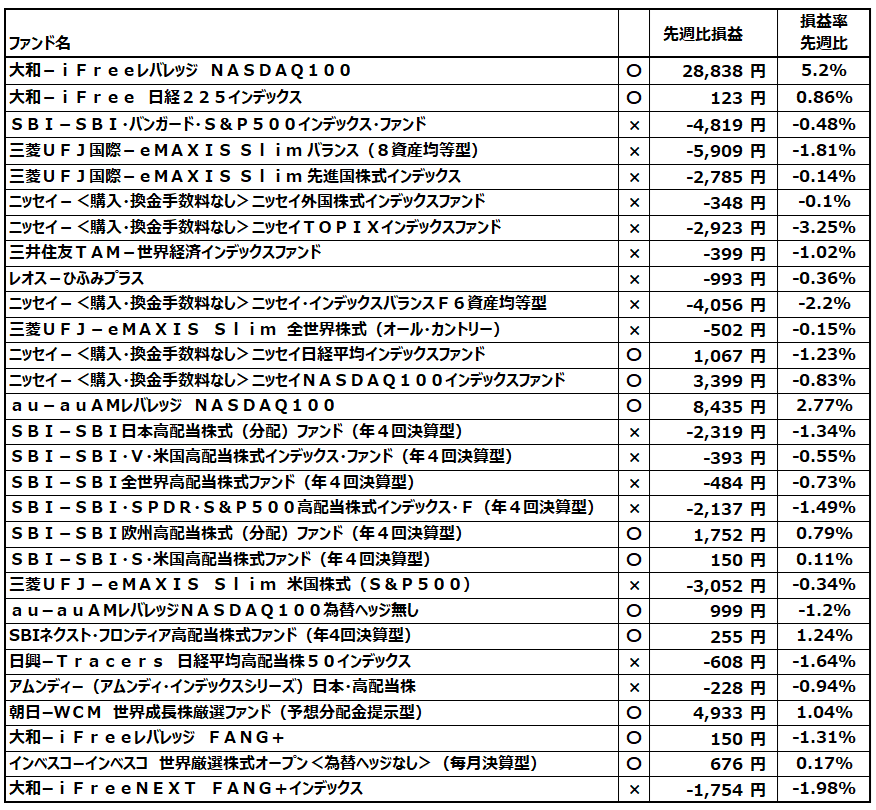 今回は勝率半々くらいかな。NASDAQと日経平均が先週比でプラス。反面S&P500と日経TOPIXは先週比負けですね。S&P500とTOPIXが下がったので、分配金系のファンドも基本下落していて、欧州とフロンティアという日米以外が上がっている感じです。こうやって見るとインデックスファンドでも指標違いで分散するもの意外と差が出るのかなと思います。