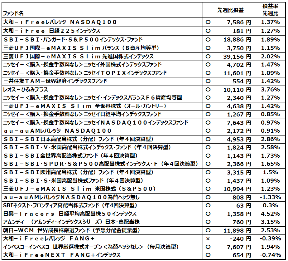 今回はレバFANG以外のファンドは勝ちです。FANG+も上がっているので、レバの方は下落からの立ち上がりに出遅れているからでしょう。週末の下落が反映されてもう一段下がるとは思いますが、レバナスの結果から考えるとFANG+が期待値を達成できる限り、レバFANGも長期的には利益が伸びると思っています