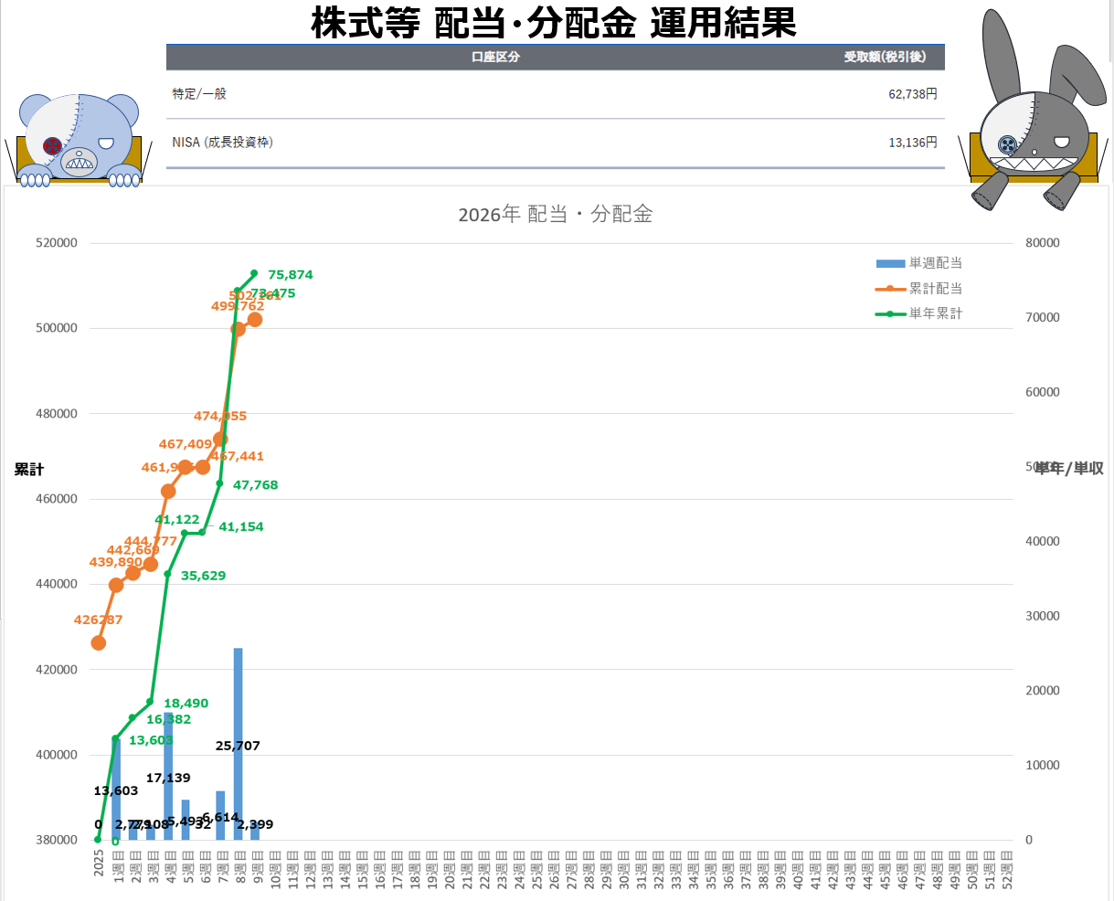 今週も配当が入り、2026年今のところ配当/分配金が入り続けています。9週連続ですね