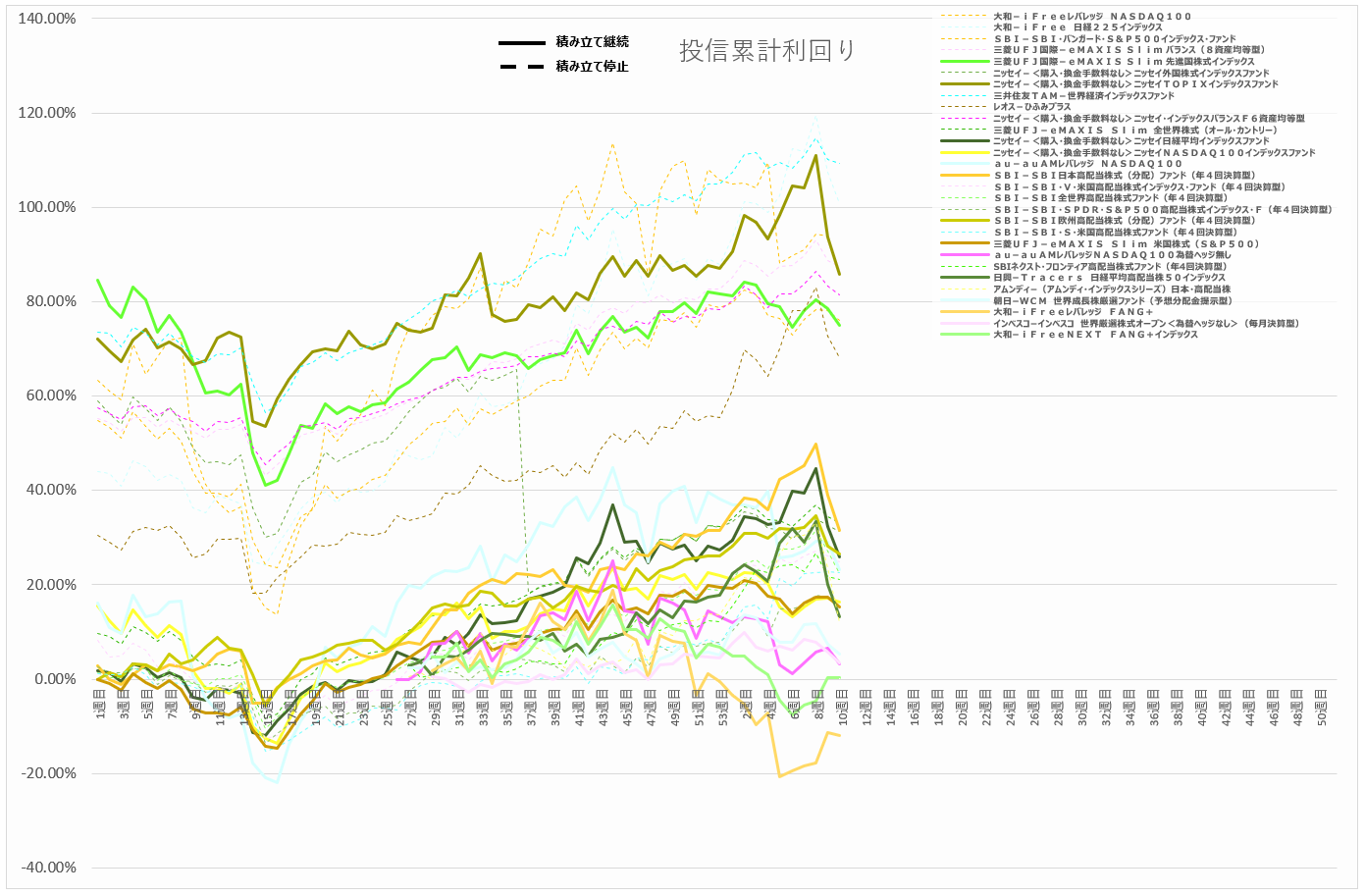 毎月積み立て続けているので、積み立てて元本増えるたびに利回りが下がりますが、それでも累計40%超えているので順調です。
