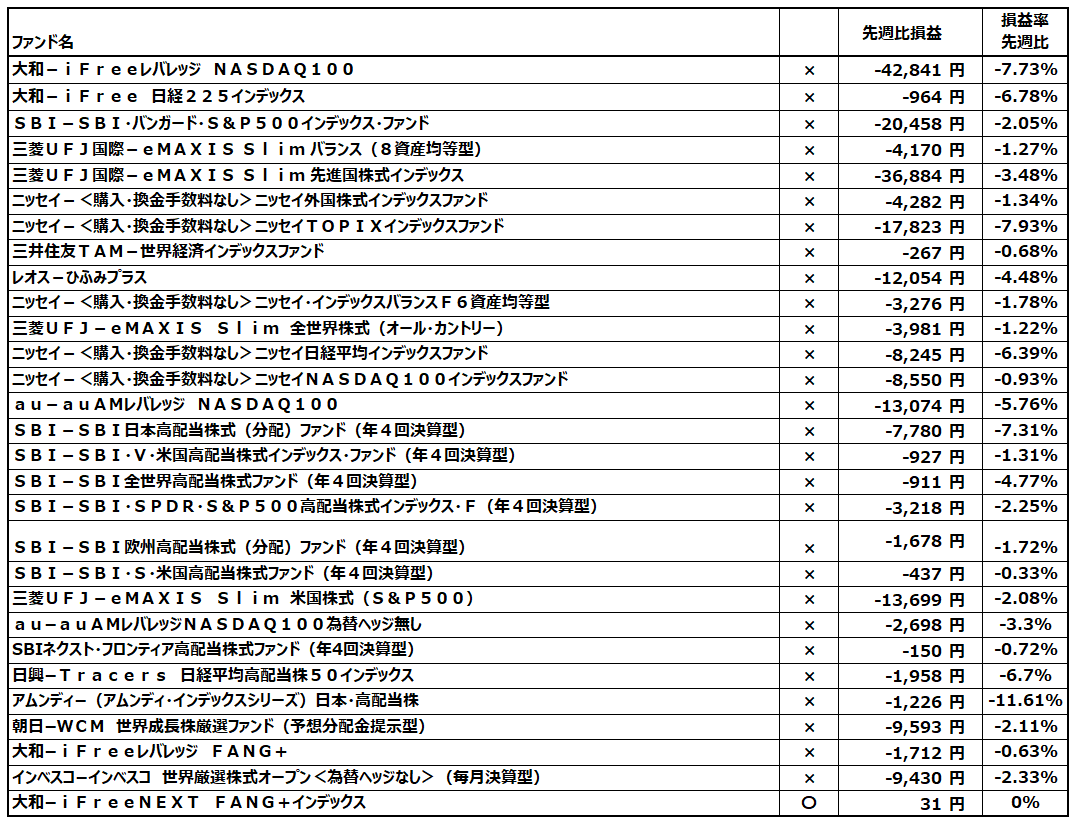 先週比ではほぼ全ファンド下落。先週残っていた若干の今年のプラスも全部なくなりました。ゆっくりまた上がるのを待ちましょう
