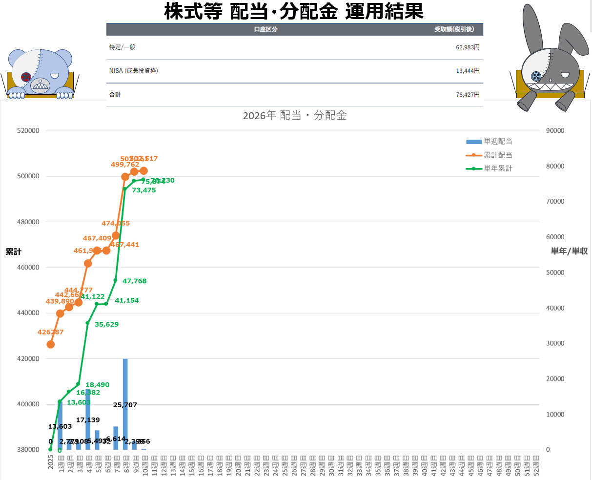 今週も配当が入り、2026年今のところ配当/分配金が入り続けています。10週連続ですね