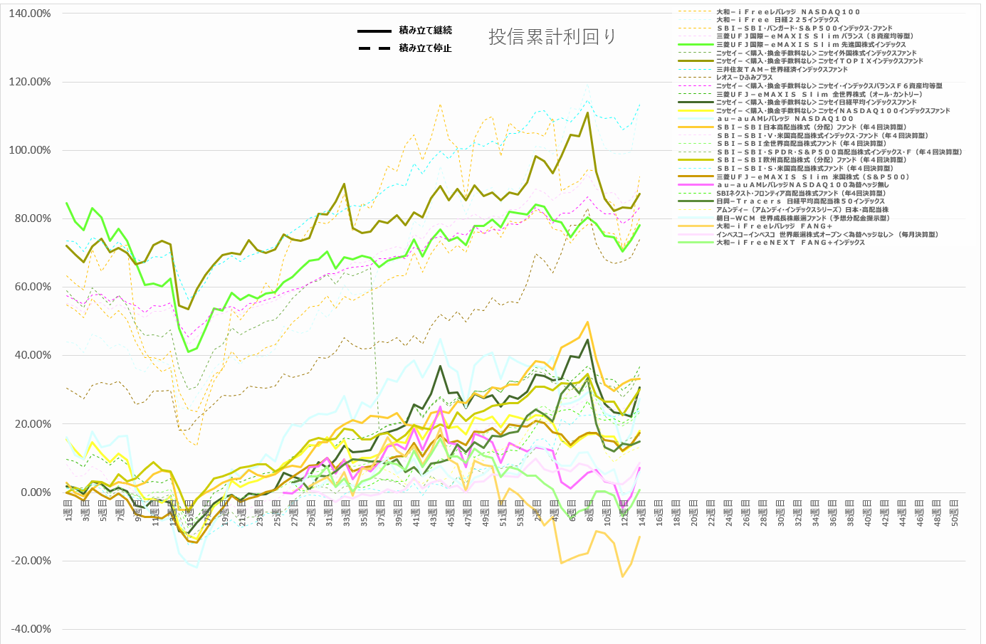 毎月積み立て続けているので、積み立てて元本増えるたびに利回りが下がりますが、それでも累計40%超えているので順調です。